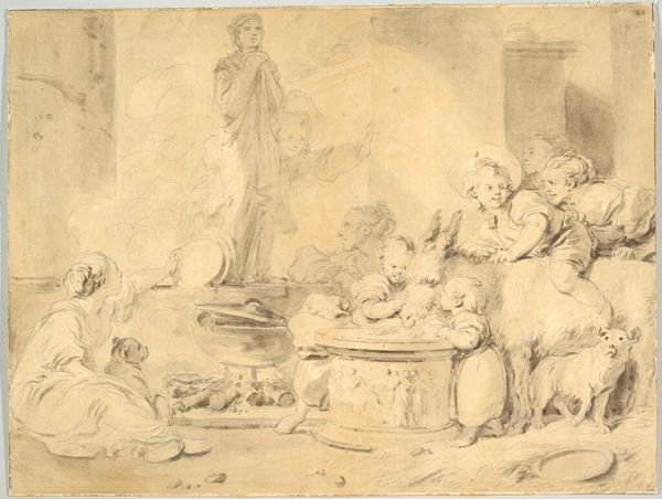 Curator: This ink drawing, "The Recognition of Achilles," comes to us from the hand of Jan Weenix, dating somewhere between 1650 and 1719. It depicts a classic mythological scene, rendered with swift, expressive lines. Editor: It's got a frenetic energy, doesn't it? All the figures are caught mid-gesture, everything in motion. It's almost chaotic, even with the stately architecture in the background. Is that the contrast that Weenix seeks? Curator: I think so. He's playing with the theatricality of the scene. You've got the grandeur of the palace and the drama of the moment—Achilles, disguised as a woman, being revealed. And look at how the ink washes emphasize the fabric, the textures of their clothes. It suggests a world of luxury, woven textiles, costly materials fueling all that posturing. Editor: The handling of the ink speaks to the practicality of quick preparatory sketches; no doubt there were multiple workshops using similar processes, repeating the stories over and over to keep pace with public appetite. The efficiency of the line work gets it down on paper fast. But consider all that ink, too. Trade routes bringing it to workshops, apprentices grinding pigments… there is real labor here, transforming materials from across the globe. It reminds me of those booming Baroque industries and the power dynamics they upheld. Curator: Precisely. The drawing invites us to think of the artist in the context of production, with so many other hands and so many other stories—not simply of mythology, but of craftsmanship and ingenuity, from the preparation of paper to its eventual sale in the public markets of the Netherlands. I suppose it's also why Weenix, as an artist who understood and even participated in these conditions, looked so acutely to history painting as the artform through which to imagine all that worldmaking in the first place. Editor: Ultimately, the drawing does more than illustrate a well-known tale. It highlights how stories were actively being remade for the social aspirations of a Dutch Golden Age through art and art markets. Curator: Right, making those ancient heroes speak to a very present, and very material reality. And with this drawing we have our own chance, hundreds of years later, to give it our own reading. Editor: Exactly. And the lines still hold—holding this vision together. Pretty amazing, huh?
