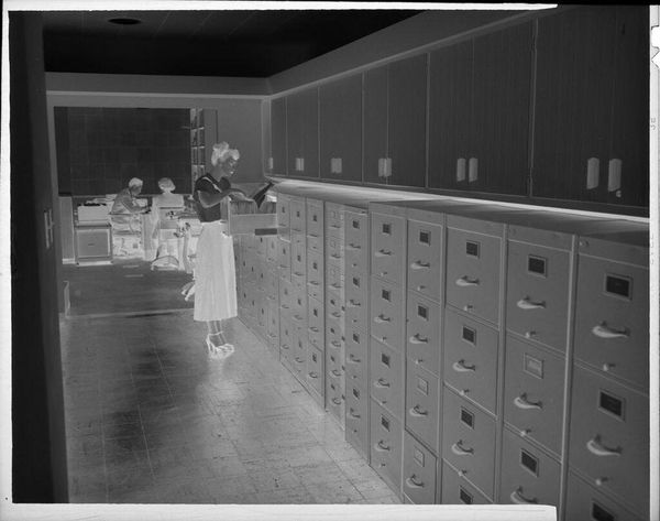 Editor: So, this is an untitled photograph by Harris & Ewing, showing a businessman at his desk. It's hard to ignore the sheer volume of paperwork and office equipment. What stands out to you? Curator: I’m struck by the photo's depiction of labor. Look at the material conditions: the desk, the papers, the machinery. These weren't just neutral tools; they shaped the worker's experience, defining their productivity within a specific social context. The photograph seems to document the physical reality of mid-century office life, doesn't it? Editor: Yes, it does. Thanks for pointing that out! I hadn't considered the office itself as a symbol. Curator: Understanding the material reality provides a good context.