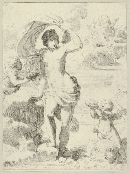 This print of a female figure on a cloud was etched by Samuel Bottschild in the Dutch Republic sometime in the later 17th century. We see a woman, elegantly draped and coiffed, rising on a bank of clouds in an oval frame. This type of allegorical image was very popular in the Netherlands at this time. Prints like this, and paintings too, were often commissioned by municipal authorities to signal their civic pride. A female figure could stand in for abstract concepts like Justice or Liberty. We see a similar visual language in use today in political cartoons and public monuments. Bottschild was working in a very competitive print market. To understand his work and the visual culture of the Dutch Golden Age, art historians consult archives, print room collections, and period publications. By understanding this world, we can better understand the public role of art.
