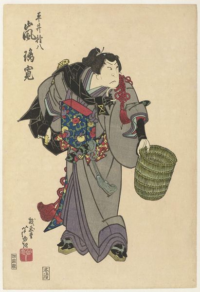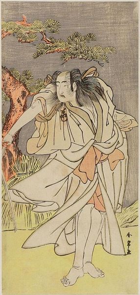 Curator: This striking woodblock print by Katsukawa Shun'ei depicts Actor Sawamura Sojuro II in the role of a Karaka dancer. It's part of the collection here at the Harvard Art Museums. Editor: The pastel colors create a surprisingly serene mood, though the actor's expression seems quite intense, almost confrontational. I wonder about that contrast. Curator: Kabuki roles often relied on codified symbols, and here we see Sojuro II holding a small bell, suggesting his character's role in the performance. The elaborate ruffled costume also signifies a particular stage persona. Editor: It's interesting how the artist uses the print medium to convey both the grandeur of the performance and the individual emotion of the actor. I'm thinking about the artist's possible commentary on rigid social roles. Curator: Perhaps the print served as a kind of cultural memory, preserving the actor's performance beyond the stage. It’s a striking image of a celebrated performer. Editor: Yes, seeing it through this lens definitely shifts my perception. It is not just a portrait of a dancer, but a cultural and political statement.