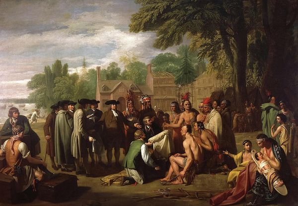Curator: The figures seem caught between wakefulness and dreaming—a visual representation of indolence. What strikes you most? Editor: The earthy materiality dominates; the brown of the ale seems indistinguishable from the earth and timber itself. I wonder what the precise pigments were, and how the process reflects broader trends in Romantic era production and social life. Curator: John Quidor, in 1839, rendered "Rip Van Winkle and His Companions at the Inn Door of Nicholas Vedder" using oil paint. Note the textures; they give an almost sculptural quality to the forms. The rendering creates a narrative pull; each face and posture speaks to the broader narrative moment. Editor: Fascinating. Note, for example, the specific type of cloth the man reading the paper is using. It tells us a lot about economics and class hierarchies embedded within Quidor’s practice. Moreover, how does his employment of certain production practices intersect with Romanticism’s ethos? Curator: There's an emphasis on individualism; see how each figure has unique features that, in combination, creates an ensemble unified by theme but divergent in portrayal. And, what to say about the landscape? It acts as a backdrop and adds atmosphere with carefully placed structures. Editor: Definitely, however, it is all still filtered through labor; it reflects the romanticism that emerged in a historical situation where nature was increasingly turned into capital. Furthermore, let’s investigate who controlled distribution for Quidor's paints at this time, it would surely give more context. Curator: Certainly a lens, or rather, one material amongst many. Quidor also skillfully deploys light; shadows that contribute to the picture's depth also give some of the people seated an almost allegorical characterization. It elevates it beyond a simple depiction of an idle scene. Editor: To broaden this even more; imagine how the tavern's material structure – wood and mortar – influenced social interactions and alcohol distribution within the community, thus shaping broader material culture. Curator: It’s clear Quidor captured more than just faces and buildings; he encapsulated the mood of a changing landscape through tangible forms. Editor: Indeed; investigating material culture alongside pictorial aesthetics gives richer insight into the nexus of Quidor's creation, even allowing space for deconstruction!