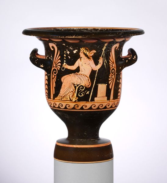 This terracotta bell krater, or mixing bowl, was created by an Ancient Greek potter. The artwork immediately strikes us with its contrasting red figures against a stark black background, a common style in ancient Greek pottery. Note how the figures, rendered in red, are neatly arranged around the vessel, creating a frieze-like effect. The negative space, defined by the black background, is as crucial as the figures themselves. The rigid geometry of the vase is softened by the fluid lines of the figures' drapery and the decorative wave patterns. The composition is structured yet dynamic, inviting the eye to circle around the krater, tracing the narrative. This piece isn't just a functional object; it's a complex interplay of form and function. It encapsulates cultural codes and artistic conventions of its time, demonstrating how the formal elements of art can convey meaning. Consider how the krater, through its very form, is a testament to the enduring power of art to communicate ideas and stories across millennia.
