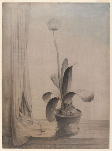 Curator: This work from approximately 1935 to 1943 is called "Milkweed and Skyscrapers," made with graphite on paper by Todros Geller. What strikes you initially about it? Editor: Melancholy. The tonal range is narrow, mostly grays, adding to the quiet stillness, which is only intensified by the single sprig of milkweed. Curator: Yes, there’s a certain duality there. Geller sets up an immediate contrast between the fragility of the milkweed—a potent symbol of resilience despite its delicate appearance—and the backdrop of the dense urban cityscape. Editor: Those towering skyscrapers become almost menacing looming behind this common weed. Do you see it as a conscious social commentary? It's hard not to in the context of that era, with anxieties around industrialization. Curator: Geller, as a prominent member of the Chicago art scene and an immigrant himself, frequently used his art to address social issues, reflecting on urban life and the immigrant experience. The milkweed then transcends its literal form. It's a symbol. Perhaps of hope or survival against imposing structures? The architecture itself represents the power structures of society. Editor: It certainly challenges a romanticized notion of progress. The flower seems to push against the geometric hardness of the buildings, asserting its own quiet beauty. Looking at it through that lens of the immigrant experience—does the flower then perhaps represent the individuals adapting to new and difficult environment, striving despite everything? Curator: Precisely. The composition emphasizes this push-pull. It reminds me a bit of other artists, like Charles Sheeler who took similar subjects—industry, cityscapes—yet approached them through hard lines and unpopulated severity. Editor: It's more humanist, warmer, here though, because the soft textures almost plead for empathy in what otherwise might be perceived as cold structures of progress. Curator: This glimpse through the window, this framing, directs us towards not only what has been built, but also towards what persists—both in the physical and spiritual realms. Editor: So Geller asks us not to ignore what gets overshadowed by modernity's ambitions, but to see it as enduring and meaningful. I appreciate how his delicate treatment creates that contrast. Curator: Geller gives voice, literally and figuratively, to a different kind of beauty and persistence. The city doesn’t erase it; rather, milkweed stakes its claim against it. Editor: A somber yet thought-provoking perspective. Thank you.