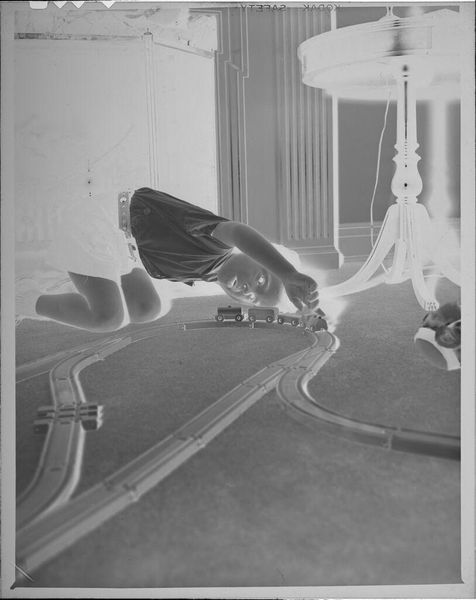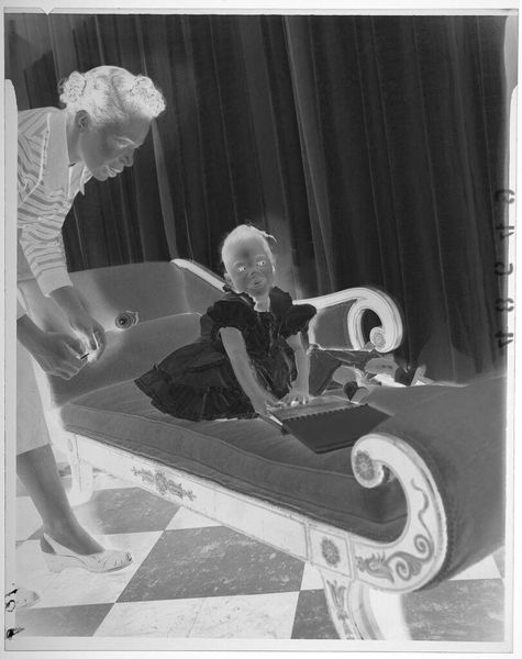 Curator: This is an untitled image by Martin Schweig, depicting a young girl with a doll and a book. Editor: There is something unsettling about the stark contrast, the high-key lighting. Curator: Consider the interplay of forms. The checkerboard floor creates a dynamic tension with the static figure on the divan. It's all about geometry. Editor: But it's also about childhood and performance. The girl is posed, perhaps aware of the photographer's gaze. Who dictates the terms of representation here? Curator: I see a fascinating exploration of light and shadow, defining shapes, pure photographic form. Editor: Maybe, but I can't ignore how power dynamics shape even the most seemingly innocent image. Curator: I appreciate your perspective. It's these different readings that keep art engaging. Editor: Exactly. The image speaks to us in multiple ways, depending on what we bring to it.