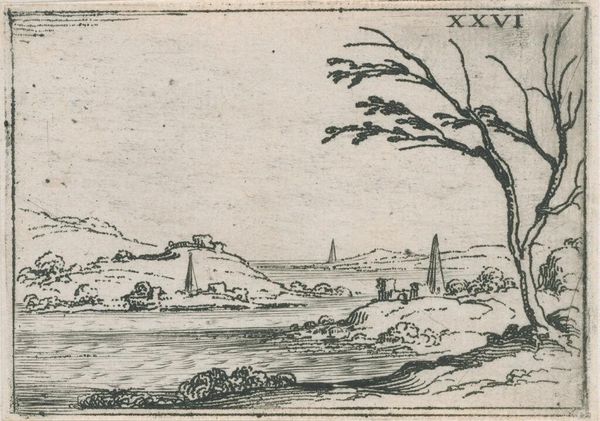 Curator: "Landschap met de profeet Jona onder de wonderboom," or Landscape with the Prophet Jonah under the Miracle Tree, dating from 1560 to 1564 and currently housed in the Rijksmuseum. It's a drawing in ink on paper, attributed to Johannes or Lucas van Doetechum. Editor: It's a world condensed. The city feels so meticulously rendered, even teeming, but it's contrasted by this single figure hunched beneath the tree. Curator: Precisely. It's a study in contrasts, isn’t it? Look at the detail rendered in the cityscape versus the more generalized treatment of the landscape on the left. This juxtaposition raises questions about what the artist prioritized portraying and how that reflected broader artistic conventions and demands of that period. How was it meant to function as an image? Editor: To me, it reveals the increasing urbanization of the period and perhaps a bit of tension. The rendering suggests the influence of civic commissions and market considerations of Northern Renaissance artistic practices. I wonder about its distribution. Curator: These prints were, I expect, pretty widely distributed at the time. These were accessible artworks that found their way into commonplace books and served educational or even political purposes depending on how the image was interpreted. Editor: So it isn't simply a picturesque biblical scene. It’s speaking to a broader socio-political discourse, then? Jonah, of course, isn’t just sitting passively, he's in a state of waiting. He is watching, with resentment in fact, over the city of Nineveh. Curator: Exactly. The narrative is important but how that story speaks to anxieties about cities and morality within the Netherlands would have resonated deeply for contemporary viewers. Think about the economics of the image itself. Paper production, printing techniques, and the entire market that sustained this type of work all had a role to play in shaping and disseminating these perspectives. Editor: It really gets you thinking about art's engagement with both political narratives and economic structures. Curator: It highlights art as an integrated social and political phenomenon. Editor: An integration beautifully etched.