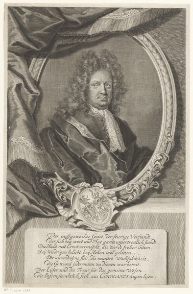 Editor: Here we have a print titled "Portret van Carl Friedrich Gerhold," made between 1721 and 1733 by Martin Bernigeroth. It’s an engraving, currently held at the Rijksmuseum. It has such a formal, almost staged feeling. I am drawn to the detailed rendering and use of text, though it appears somewhat faded to our contemporary eyes. How do you read an image like this one? Curator: This is fascinating! We're not just looking at a portrait of an individual, but a carefully constructed presentation of power and status. The oval frame itself, seemingly cracked, with the drapery pulled back as if unveiling the sitter… what might these symbolic framing devices tell us about the sitter's identity, and his era’s view of power? Editor: I notice the text inscription; the print functions somewhat like a plaque or a printed epitaph. Curator: Precisely. It immortalizes him through words and image. Bernigeroth isn't just depicting Carl Friedrich Gerhold; he is creating a lasting image designed to be circulated. Consider the wig, the clothing, even the coat of arms at the upper right— these are all visual cues speaking to Gerhold's place in society. This image is meant to reinforce ideas of aristocracy and leadership to a wide audience. What stories do you think images such as this would have told its original audience? Editor: I see…it’s about permanence and spreading a particular narrative. It makes you wonder about who controlled those narratives. It seems relevant still, that then and even now images tell specific, tailored stories. Curator: Indeed. It underscores the continued cultural weight that visual symbols carry. Examining such works urges us to delve into the memory they encode, prompting inquiries into who gets remembered, and the intentionality behind such artistic constructions of historical identity.