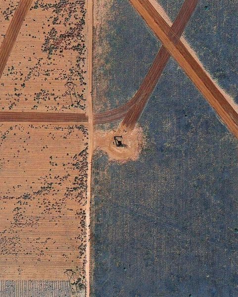 Editor: This is Mishka Henner's "API 21930915 San Andres, TX," a 2012 photograph. I'm struck by the strong diagonal lines; it's almost dizzying! And then there's that stark industrial element breaking the pattern. How do you interpret this work from a formalist perspective? Curator: Note how the parallel lines, alternately dark and light brown, establish a powerful rhythm. Consider how that rhythm is then disrupted by the off-center placement of the oil pump, almost as an after thought. How does the artist use colour? Editor: Well, the limited palette, earthy tones of brown, tan, and a little grey makes it quite striking, not very dynamic. The colours seems monotonous, until that singular construction introduces complexity and form. Curator: Precisely. The texture, or the illusion thereof, becomes crucial. The image presents the surface as being etched. From this, it becomes about planes in the earth, with the oil pump breaking the pictorial logic. Now think about semiotics – what signs are present and what do they suggest in our culture? Editor: The strong geometric linearity implies control, and perhaps imposed order on nature; the mechanical structure suggests that progress and industry undermine the serenity and impose form on function. Curator: Yes, it's about dissecting the visual relationships within the image itself, independent of any narrative context. The lines function as pure form, their repetition creating a visual tension with the singular structure. Does our reading require something about where it exists? Editor: Not at all! It's fascinating to see how a purely formal reading reveals such a complexity of meanings simply through line, shape, and composition! It shifts focus away from the immediate topic of environmental awareness into that of formal consideration and pictorial deconstruction. Curator: Exactly. By prioritizing the formal elements, the artwork creates a framework for deconstruction and alternative readings, which are valid within its visual form.