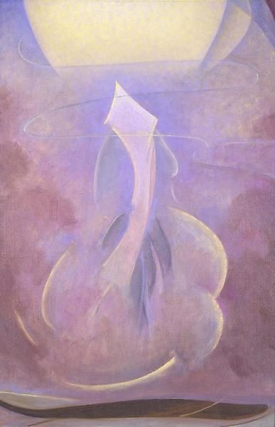 Curator: Agnes Pelton painted "Memory" in 1937, and it's rendered in watercolor. What are your first thoughts? Editor: A tranquil and almost ethereal mood washes over me. The pastel colors and the biomorphic shapes contribute to its dreamy atmosphere. Curator: Pelton's watercolors allowed her to achieve precisely these translucent effects. Considering the era and location – pre-war America, the California desert – what kind of spiritual and material needs do you imagine motivated Pelton and her patrons? Editor: The structure feels inherently unbalanced, yet there is a visual harmony created by the gentle curves of the various elements. It has an ascending visual rhythm that guides the eye upwards towards a sort of… celestial space. It also hints at a deep connection between the terrestrial and the cosmic. Curator: It does, doesn't it? In her work, Pelton often combined abstract forms with elements of nature and spirituality. Can you discuss that a bit more in this particular piece, touching on how the watercolor medium helped her to do this? Editor: Well, consider the interplay of light and color—especially the gradations of blues, lavenders and creams—in this composition. Those gradations emphasize the painting's ethereality and transcendence. Those choices almost remove the artist’s hand from the process and let light speak. The composition has an inherent upward momentum. This evokes a longing, as if a desire or a reaching to a greater, or divine… source, if you will. Curator: Yes. The biomorphic shapes and their placement definitely nod to those more existential human questions. Given that she was working in relative isolation and obscurity for a long time, how did material conditions in the Southwest impact the artistic forms themselves, do you think? Editor: It’s easy to impose readings… but… there is also a loneliness and stillness in it, reflecting Pelton's singular, perhaps solitary pursuit of spiritual understanding through her art. Her use of light, the very substance of illumination in the desert, conveys an inner glow. The colors suggest this luminescence and the subtle transitions mirror a meditative practice. Curator: So, ultimately the form of this work reveals a deeper intention about inner transformation... a revealing luminosity. Very insightful. Editor: Agreed. Pelton's 'Memory' transcends being just a pretty painting. It invites a contemplative engagement, a connection to the mystical that lingers long after one has viewed it.