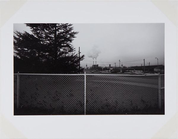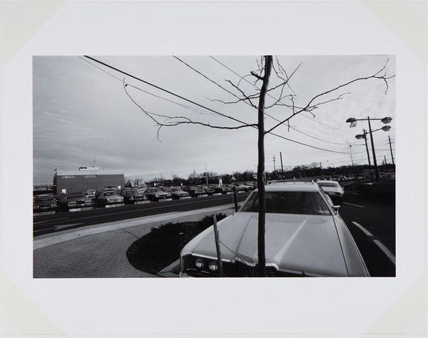 Editor: This is Lawrence McFarland's "Long Island Landscape (office park with sign in foreground)." The black and white tones create a sense of melancholy and the composition feels very deliberate. What do you see in this piece? Curator: The stark contrast emphasizes the geometric forms – the rigid lines of the office building, the sign's sharp angles, and even the repetitive rhythm of the lamp posts. Note how McFarland uses the tonal range to flatten the space, creating a tension between the foreground and background. Editor: It's interesting how the key hanging from the sign is the only object that has depth and looks 3-dimensional. Curator: Precisely. It disrupts the otherwise planar composition, perhaps serving as a symbolic gesture, questioning the nature of access and what is locked away. Editor: I hadn't considered that! Thanks for the formal breakdown. Curator: My pleasure. The formal elements are always the starting point for deeper inquiry.