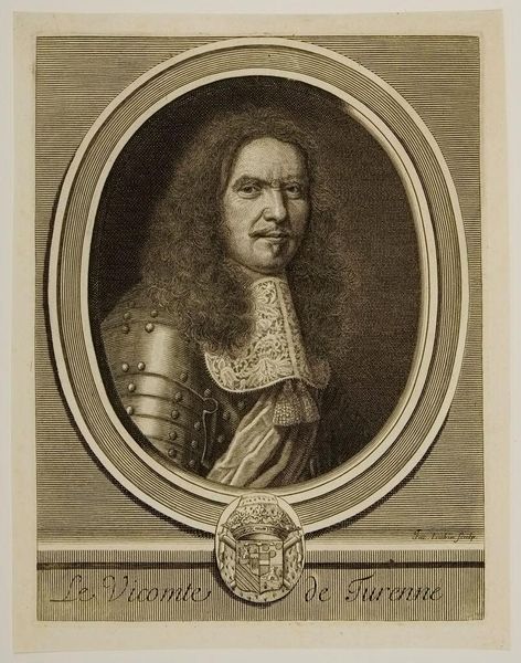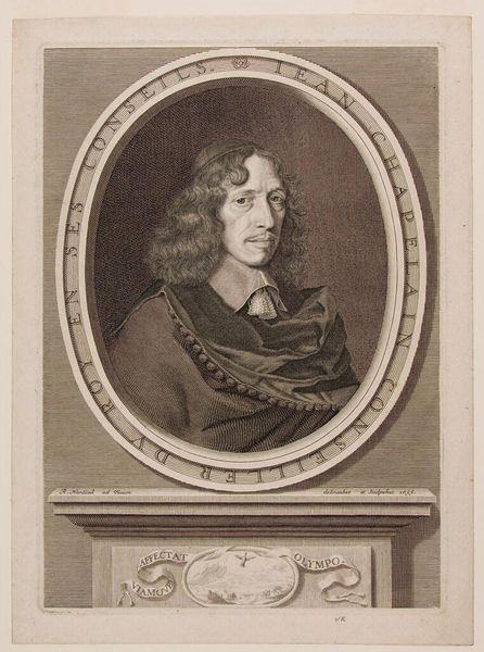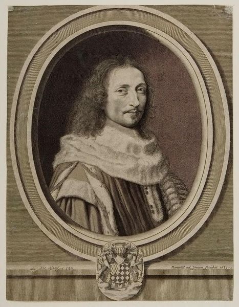 Curator: Here we have Robert Nanteuil's portrait of Gaspard de Fieubet. Editor: Immediately, I’m struck by the sitter's self-assured gaze, almost confrontational, framed by that elaborate oval. It conveys a clear message of status. Curator: Absolutely, and it's essential to recognize Fieubet's position as a member of the Toulouse Parliament. Nanteuil's meticulous engraving captures the social and political landscape of the time, reflecting the power dynamics inherent in portraiture. Editor: The oval framing recalls classical laurel wreaths signifying importance, while the coat of arms adds another layer of symbolic meaning, speaking volumes about lineage and privilege. Curator: Yes, and it makes me consider the representation of power and the role of portraiture in reinforcing social hierarchies. Editor: Considering Nanteuil's skill and Fieubet's confidence, it is a rather impactful visual representation. Curator: Indeed, the intersection of artistry and social context offers much to contemplate. Editor: I agree, and the enduring power of symbols still resonates even now.