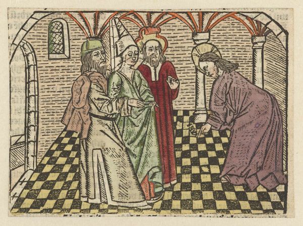 This woodcut, "Parable of the King and the Servant Who Did Not Forgive," was created in Antwerp by the Master of Antwerp, using a relief printing process. Notice how each figure is delineated through stark lines carved into a block of wood. Ink was then applied to the block's surface and pressed onto paper, a relatively inexpensive method that allowed for the wider distribution of images and ideas. The addition of color by hand adds complexity, with each hue carefully applied within the block's outlines. The checkerboard floor creates a sense of depth in the scene, but also highlights the graphic nature of the woodcut. The relatively economic medium reflects the parable's theme of forgiveness and judgment. The woodcut's accessibility aligns with the story's intent to reach a broad audience. The use of printmaking facilitated the transmission of moral teachings, connecting artmaking directly to the social and cultural values of the time. Through its material and production, this work blurs boundaries between fine art, craft, and popular communication.
