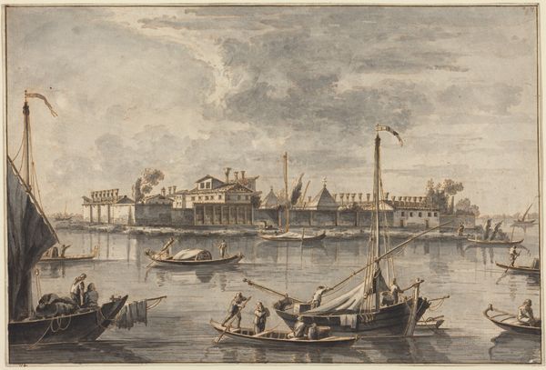 Editor: Here we have Robert Sayer’s "View of the Admiralty Warehouse in Amsterdam," likely created between 1752 and 1754, a mixed media piece including drawing and watercolor, currently housed at the Rijksmuseum. It's interesting how he manages to depict such a busy cityscape with such a light and airy touch. What do you see in this piece, focusing on its structure? Curator: Primarily, the composition seems governed by a precise linearity. The buildings and quays are rendered with an almost architectural exactitude, aren't they? Observe the careful arrangement of forms, the geometric shapes of the buildings contrasted against the fluid lines of the water and ships. Notice, as well, how colour serves to subtly reinforce this sense of order. Do you see it? Editor: I see how the muted colors create a sense of unity. The browns and blues seem to reflect off each other, holding the image together. It also highlights how the Baroque influence impacts the cityscape theme. How do these aesthetic elements interplay? Curator: Exactly. Consider the implications of that deliberate colour choice and precise lines. They underscore a commitment to order, to a rational apprehension of the world. Semiotically, this visual articulation suggests a specific understanding of power, commerce, and the controlled environment of the port. Do you think the artist agrees? Editor: I'm starting to think Sayer emphasizes human structure in an orderly and perhaps powerful way, making this mixed media not merely representational but also an argument about a stable world view at the time. Thank you. Curator: Indeed. Through its form, this seemingly simple cityscape reveals a deeper ideological engagement with the world. Appreciating the underlying formal qualities encourages such interpretations. I found your insights quite helpful.