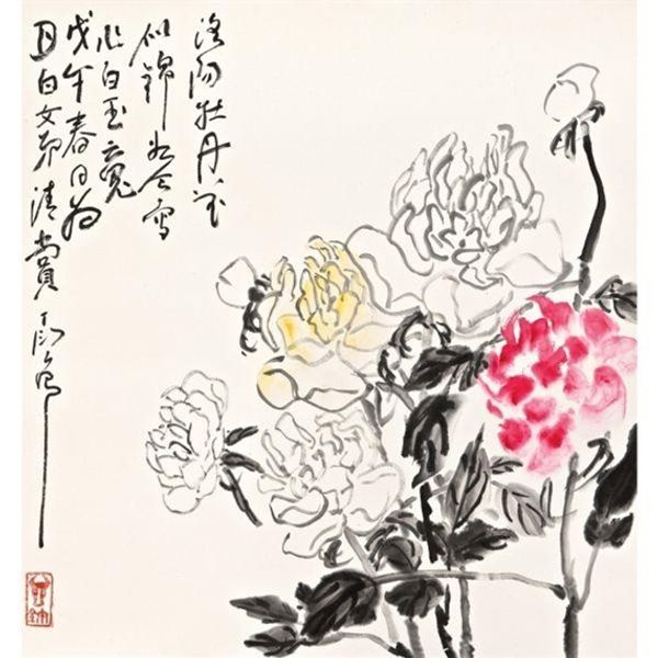 Editor: This watercolor is titled "Colorful Lotus," painted by Huang Yongyu in 1987. There is something peaceful and also quite energetic in the brushstrokes. What do you see in this piece? Curator: Primarily, I see a composition driven by contrasts. Note the stark juxtaposition between the delicate rendering of the lotus petals and the bold, almost aggressive, brushstrokes that form the background. This tension between fine detail and abstract expression is the core of the artwork's visual interest. Editor: Yes, the background does seem very different from the lotuses themselves. Is the contrast simply to emphasize the flowers? Curator: It goes beyond simple emphasis. The loose washes of the background, predominantly cool blues and grays, flatten the space and create an ambiguous environment for the subject. The energetic lines do more than just define form. They serve to destabilize and invigorate the field. Editor: That’s interesting, so it's almost as if the background is competing with the foreground. How do you see the calligraphy fitting in? Curator: Precisely. It mirrors the brushwork found in the image's body and it’s as integral to the composition as the flowers. While they bring balance, its presence speaks to the artist's deliberate disruption of traditional picture space, challenging us to read the painting as a complex interplay of line, form, and texture, rather than just a representation. Editor: I never considered that the background contributes so much. This perspective helps me see how much the form of a piece impacts the mood. Curator: Indeed, by looking at brushwork, colors, shapes and the relations between these components we're really digging into the foundations of this work!
