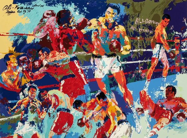 Editor: LeRoy Neiman's "Superdome Super Bowl," painted in 1982 using oil paint, bursts with a riotous energy. All those colors and dynamic brushstrokes almost make me feel like I'm in the stands. What social commentary, if any, do you see in Neiman's depiction of this specific Super Bowl moment? Curator: Neiman, throughout his career, wasn’t just capturing a game; he was capturing a spectacle. His Fauvist and Expressionist techniques reflect a society increasingly fascinated by celebrity and commercialism. How does the almost abstract depiction of the crowd contribute to the narrative? Editor: It’s like the crowd is a unified entity, less about individual fans and more about the collective frenzy and shared cultural experience, this unified wall. Curator: Exactly! And within that collective frenzy, we have these hyper-masculine figures clashing, engaging in physical contest within clearly defined boundary lines of class, race and gender. This can be understood as an abstracted lens to view 1980s American values. Does the aggressive impasto contribute to the piece's tension for you? Editor: I see it now! Yes, those thick, almost violent strokes add to that feeling of intense physicality, almost a discomfort in witnessing that level of energy contained within the stadium. How do you reconcile this kind of celebratory portrayal with critical perspectives on the sport's role in reinforcing power structures? Curator: Neiman presents this cultural phenomenon of Super Bowl; the extreme close-up highlights violence with the crowd that celebrates it and amplifies the idea that sports perpetuate certain power dynamics of a highly sexualized masculinity that continues to prevail today. But maybe the visual chaos reflects his own questioning? Editor: That's a really interesting way to view this seemingly straightforward depiction of a football game. I didn't think of all the ways this painting serves as social commentary on the time. Curator: The work resides in tension between documentation and expression. What has become clear to me is that context is king! I can not analyze artworks in a vacuum.