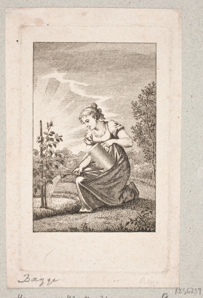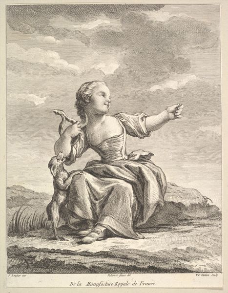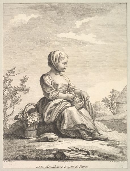 Pierre François Tardieu made this print, Little Girl Holding a Garland of Flowers, as part of a series reproducing designs made at the Manufacture Royale de France. It's made using etching and engraving, processes that involve painstakingly incising lines into a metal plate, which is then inked and printed. These prints were not just artworks in their own right; they were also advertisements for the porcelain factory. The factory itself was an engine of production, employing skilled artisans to create luxury goods for the aristocracy and emerging bourgeoisie. The garland of flowers held by the girl echoes the delicate floral motifs often found on porcelain. It reminds us of the artistry involved in both printmaking and porcelain production. Consider the labor involved, from the engraver meticulously cutting lines into the metal plate, to the porcelain painter carefully applying pigments onto a vase. In this context, even a seemingly innocent image of a child becomes a window into the complex world of 18th-century manufacturing, commerce, and the intimate connection between art and industry.