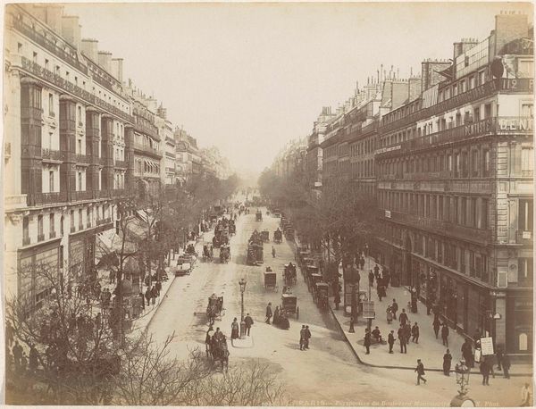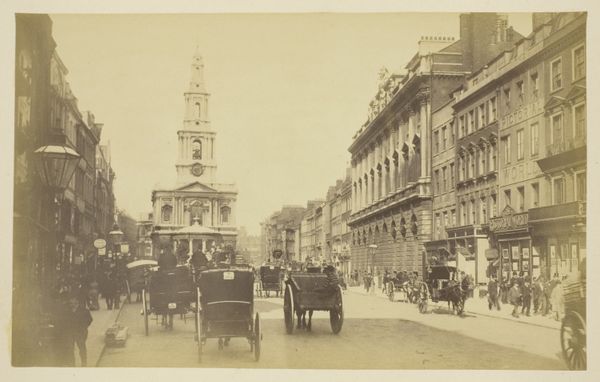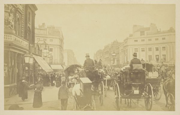 This photograph, titled *Piccadilly*, captures a street scene in London, created by an anonymous photographer. It presents a slice of Victorian life, a moment frozen in time that speaks volumes about class and societal structures. The image is filled with horse-drawn carriages, suggesting an era defined by a particular pace and social hierarchy. The architecture looms in the background, symbolizing permanence and power. Bare branches reach across the frame, and a subdued palette evokes the city's atmosphere, laden with coal smoke and the weight of industry. One can consider the power dynamics at play here: the drivers, the passengers, and the unseen labor that supports this world. Where are the people who maintain these buildings, tend to the horses, and sweep the streets? The anonymity of the photographer encourages us to reflect on the stories untold, the voices unheard in this representation of a bygone era.