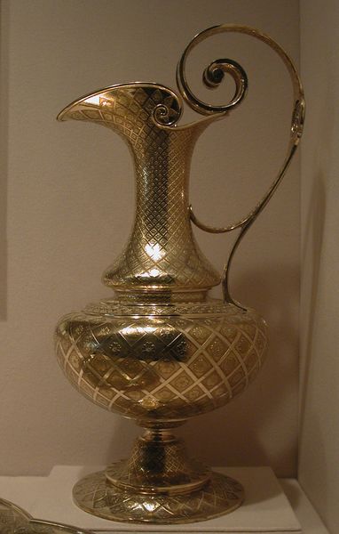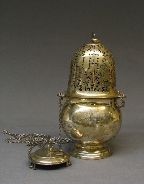 Curator: Here we have a gilded vase created in the 19th century. The piece, now residing at the Metropolitan Museum of Art, is attributed to Elkington & Co., renowned for their contributions to decorative art. Editor: It immediately strikes me as decadent—the intense, all-over gilding, the elongated, almost attenuated neck...it exudes a kind of luxurious excess. Curator: It’s more than mere ornamentation, wouldn’t you say? The elaborate engravings across the bulbous body present an interplay of foliage and intertwined figures... their cultural symbolism deserves attention. Editor: Absolutely. Formally, though, it is quite interesting to see how the linear verticality of the neck contrasts and ultimately resolves with the rotund volume of the vase’s body, bringing visual balance to the composition as a whole. Curator: And there’s that sphere, that sort of ‘pregnant’ rondure in the midsection – speaking volumes to me, suggesting creation, the womb. Consider also the choice of gold itself, associated transhistorically with power, divinity. These aren't casual choices. Editor: Do you think that the reflective quality adds to this expression? The metal literally casts the light around the carvings and emphasizes the geometry, which may provide a sense of its significance. Curator: Indubitably. Metal endures; it reflects not just light, but historical memory, artistic ambition, the echoes of empires. What story is repeated here, though? The visual elements certainly suggest that its makers wished to connote some kind of exotic, opulent fantasy, a pseudo-Orientalist theme for consumption. Editor: Perhaps a demonstration of industrial skill, flaunting the mastery over precious materials and complex crafting methods, more than any genuine attempt to replicate historical symbolism. Curator: It reveals the Victorian era's obsession with not only amassing wealth but signaling it conspicuously through decorative art and design. Its story lies within the material but in its reflection on society at the time. Editor: A gleaming, fascinating microcosm, isn’t it? All the material and structural considerations we've been mentioning, the balance of verticality, the surface patterns, now further clarified with your iconographic understanding. Curator: And an artwork which seems quite relevant even today given society’s concerns about wealth and cultural appropriation. It can offer us a glimpse of our shared, symbolic history.