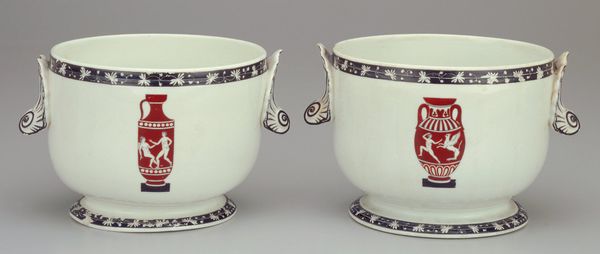 This pair of jardinières, or ornamental flower pots, were made from earthenware by an anonymous maker. The process begins with clay, which is mixed, formed, fired, and glazed. Though we can’t know for sure, these were likely slip-cast: liquid clay poured into plaster molds. Once set, the molds are removed, leaving a perfectly formed shape, ready for decoration. The decoration is what makes them so intriguing. They are embellished with classical motifs in contrasting colours. Look at the carefully painted borders, and the stylized vessels containing figures. These designs give the jardinières a sense of antiquity, like relics from ancient Greece or Rome. Yet, the mass-produced quality of the earthenware suggests a more recent origin, tied to industrial production and consumer culture. Ultimately, the jardinières are a reminder that even the most seemingly straightforward objects can be complex products of their time, reflecting both the skill of the maker and the broader social context in which they were created.