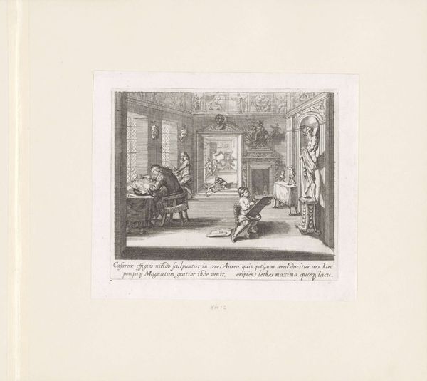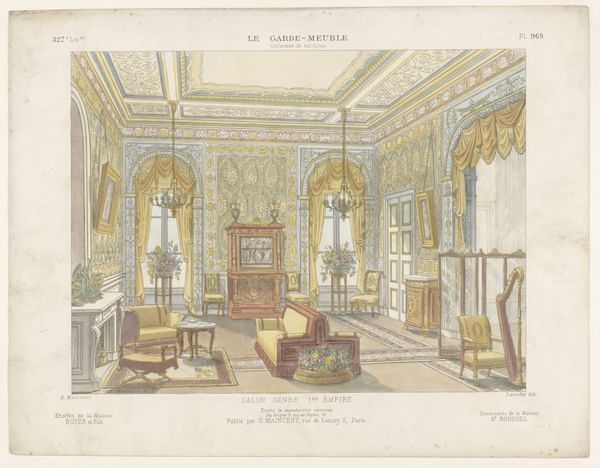 Curator: Ah, another peek into the past! This is "Kong Frederik 6.'s Arbejds- og Sovekabinet," a lithograph dating from between 1840 and 1889, currently residing at the SMK, Statens Museum for Kunst. It offers us a view into King Frederik VI's workspace and bedroom. Editor: My first impression is of…quiet formality. All grays and creams and stiff lines. It's not exactly bursting with joie de vivre, is it? It looks meticulously ordered, but does it suggest something also oppressive? Curator: I can understand that impression. The lithograph definitely has a certain gravity. Let’s consider the composition. It’s highly structured; almost every object seems meticulously placed. The light is distributed quite evenly; no theatrical shadows here! The objects mirror the personality. I'd label this artistic interpretation as within the realm of realism and academic art. Editor: Realism for sure. The objects – portraits, furniture, even that screen in the corner - feel meticulously rendered. Almost as though the artist tried to present things as exactly as they appear in real life. I feel as if the image intends a certain exactness as opposed to leaving any form of mystery for interpretation, however the charm and artistry lie exactly there: an opportunity to capture a frozen instant. But the very subject matter…a royal’s workspace and bedroom! Seems terribly intimate to bring such perspective to the canvas. Curator: Indeed. What strikes me is the way the image invites contemplation on power and privacy. These personal objects, carefully arranged, offer a glimpse into the life of a monarch. He clearly lived a double life like everyone else, combining both office work and basic necessities to fulfill on a day to day. Editor: Absolutely. It makes me wonder about the choices King Frederik made when creating this room. A room for basic everyday functions... what an interesting choice for an artwork. The collection and placement of paintings are particularly telling. It reveals so much while attempting to project, I imagine, the aura of power and accomplishment. Is it about conveying absolute authority or just getting a good night’s sleep? Curator: Perhaps both were always intertwined in his life, just as the image combines his bedroom with his working space! Overall the image remains an exceptional window into a slice of Danish history and royalty, all achieved through this restrained yet compelling lithograph. Editor: Absolutely, you are spot on; such a still scene. The eye is held captive by all those frames with pictures…like he held his power inside his work. A really lovely depiction through detail, I am glad we examined it.