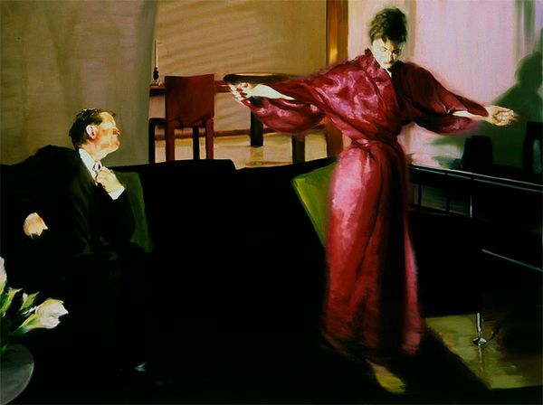 Curator: Nigel Van Wieck's "Sit Out" offers an intimate, yet somewhat detached glimpse into a commonplace urban setting, though its exact date of creation remains unspecified. What catches your eye upon first viewing? Editor: Hmm. The colour palette strikes me instantly—that electric violet blouse against the muted blues and yellows… there's a discord, an almost Hopper-esque alienation emanating from the canvas, a strange vibe I cannot put my finger on. Curator: Indeed, Van Wieck masterfully utilizes pastels to evoke a mood of both immediacy and detachment. Notice how the planes of color intersect and define the figures. There's a geometric quality underlying the representational forms—the very deliberate arrangement of shapes. Editor: It is like a stage set; there's this stillness and expectation. I feel the figures are waiting for something—or running from it, or, maybe they are the stage of life itself, acting as actors and stagehands. The painting just hangs in the moment of time. It seems to blend into neo-expressionism, but with more focus on realism in it too, at the same time. I am conflicted, a weird painting! Curator: Interesting. I find Van Wieck's choice of pastel quite crucial here. The medium itself lends a certain fragility to the scene, a sense that this moment is fleeting, transient. The loose strokes create texture, a physical manifestation of the painting process itself. Editor: You know, I keep coming back to the title, "Sit Out." Is it a deliberate invitation, or an exclusion? The seated figure in the bright shirt could just as easily be waiting to be asked to dance as contemplating leaving. It’s so loaded. Curator: I believe the ambiguity is deliberate. Van Wieck prompts the viewer to confront these dualities—of closeness and distance, exposure and concealment—forcing them to confront a potentially complicated reality, within an otherwise standard environment. Editor: It is the power of insinuation. By the exclusion, we may interpret a different message as it resonates with our human experience. Like with old movies, it offers both beauty and conflict that is not immediately obvious to us. Curator: Precisely, the very form and structure underscore the subject. After further reflection, I appreciate how the unresolved narratives linger. Editor: It feels unfinished yet perfectly resolves at the point of experience, something beautifully melancholic.