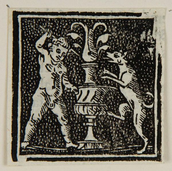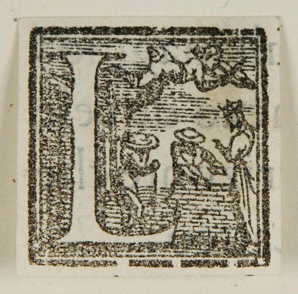 Curator: I see an initial "F" here, but the composition has an emotional darkness—a solemn heaviness. Editor: The Harvard Art Museums hold this anonymous work, entitled “Letter F.” Notice how the density of the ink creates that somber effect. Curator: Yes, and the "F" itself enframes a scene, figures entangled. There’s a suggestion of classical forms, angels perhaps. Their faces are not serene; there's almost a desperate quality to their gaze. Editor: I’m drawn to the texture. The surface seems worn, the lines uneven. It makes me wonder, was this mass-produced or carefully carved? Was it part of a larger printed page, or an individual statement? Curator: The symbol of the letter, combined with the figures, could represent faith, fate, or even folly. It creates a moment of intense contemplation despite its small size. Editor: It's a tiny reminder that even functional design objects carry the weight of human intention and labor. Curator: Absolutely. This letter embodies a blend of form and the figures. Editor: A curious piece, indeed.