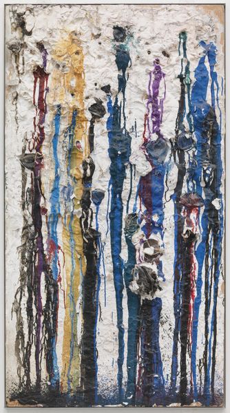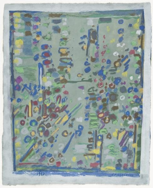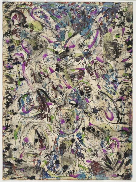 Editor: This is Howardena Pindell’s *Untitled #100*, a mixed-media piece from 1979. The textures are just incredible! It’s almost overwhelmingly tactile, like an explosion of confetti frozen in time. What do you see in this piece, from your perspective? Curator: Well, I see a powerful statement embedded within that "explosion." Pindell's use of mixed media, especially after her life-altering car accident, becomes incredibly significant. This wasn’t merely an aesthetic choice. Can you imagine the social context of the late 70s and the pressure on artists, especially women of color, to conform to certain narratives? Editor: Absolutely, the art world was hardly a level playing field. Curator: Precisely. And Pindell, with her "matter-paintings," directly challenges that. By incorporating unconventional materials – the confetti, the glitter, the often-overlooked scraps – she's injecting marginalized experiences, even discarded ones, into the art historical canon. What do you make of the purple background? Editor: I think it is eye catching and is used as a space of experimentation. It reminds me that Pindell was a strong advocate for diverse representation, a political act of subversion within a predominantly white, male art establishment. Curator: Exactly! So it becomes more than just confetti. It is loaded with social meaning. Pindell utilized the canvas for social commentary to expand her own cultural heritage into something bigger. How do you interpret that? Editor: The idea of reclaiming discarded materials as a commentary on marginalized communities makes this artwork incredibly impactful. It shows how an artist can bravely transform personal tragedy into a statement on the sociopolitical context of their time. Curator: It makes me see it differently, too, knowing how powerfully Pindell integrated art with cultural forces. Editor: Absolutely! This definitely provides some great food for thought.