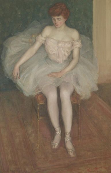 Editor: This is Renoir's "The Dancer," painted in 1874 using oil paint. I am immediately struck by the ethereal quality of the ballerina's tutu. How do you interpret this work through a formal lens? Curator: Notice how Renoir utilizes color and light to create a sense of movement. The juxtaposition of the soft, blurred edges of the tutu against the more defined form of the dancer's body. He masterfully plays with textures to enhance the optical experience. It presents us with a spectacle of form that alludes to, more than captures, the dance. Do you find the composition balanced? Editor: Yes, it does seem balanced, even though the figure is slightly off-center. It allows the eye to move around the painting, engaging with the negative space. Could the brushwork serve another function besides creating balance? Curator: Certainly. The broken brushstrokes are intrinsic to the Impressionistic style and play a crucial role in suggesting fleeting moments, emphasizing light, and capturing the optical sensations the artist experienced. Consider how the application of paint contributes to the overall expressiveness of the composition. Editor: I never considered the texture's contribution to the optical experience. Looking at the way Renoir blurred the tutu makes me notice how the shape dissolves within light and shadow. Curator: Precisely. Renoir's masterful manipulation of these formal elements elevates the painting beyond a mere depiction of a dancer; it explores how perception functions, while prompting an interest in coloristic balance within art history. Editor: That is indeed an enlightening observation. Thank you for highlighting how form and technique are crucial to appreciating the deeper meaning within Impressionist artwork.