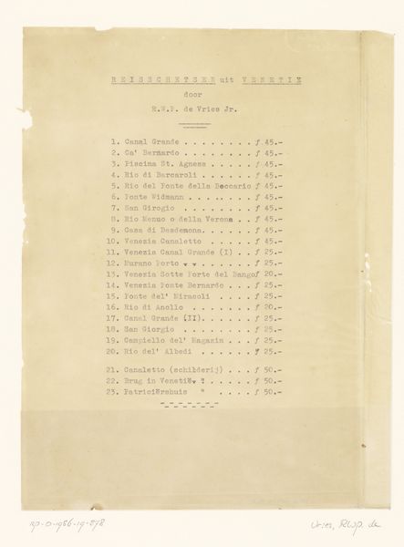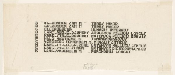 Reijer Stolk made this list of back muscles in both German and Latin, probably printed some time in the first half of the 20th century. It's got this orderly arrangement, almost like a musical score, each muscle carefully named. The type is solid, almost like blocks, creating a pattern that's both informative and surprisingly graphic. What grabs me is the contrast between the precision of the language and the implied messiness of the body. The starkness of the black ink against the pale paper makes the list feel like a scientific document, yet it's naming the very things that allow us to move, to feel, to be alive. Look at the way the lines of text are interrupted by horizontal bars. They seem to emphasize the architecture of the body, with each phrase like a building block in our physical structure. This piece reminds me of the work of Hanne Darboven, the way she turned information into art. Stolk's list isn't just about anatomy; it's a reflection on how we try to categorize and understand the beautiful, chaotic reality of our bodies.