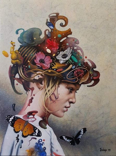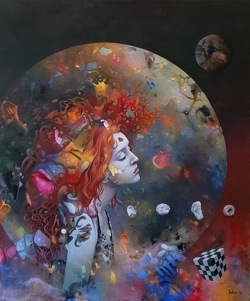 Editor: We are looking at "Nika," a mixed-media painting by Dragan Ilić Di Vogo, created in 2022. I’m struck by how this portrait melds a realistic figure with surreal, almost dreamlike elements. What’s your initial take on it? Curator: Ah, "Nika." It's a curious piece, isn't it? I see a collision of worlds—the familiar human form juxtaposed with a cascade of symbolic detritus. A personal universe orbits her, and in a way, perhaps it *is* her. Are those stones embedded within her, or are they orbiting *around* her, do you think? It reminds me of childhood games where inanimate things gain sentience and transform into talismans of another place. Editor: I think both, really. Embedded and orbiting. There’s a vulnerability in the figure's expression, but the adornments are so assertive. There’s a kind of beautiful tension between those two things. The use of oil paint makes it looks both classical and modern. Curator: Absolutely. There's something deeply primal here too. She's a modern-day sorceress. Do you feel the pull of Expressionism there in her gaze? The artist might suggest a state of heightened emotion through not just her face but everything attached to her figure! This invites you to be aware and question what you’re really seeing and how you interpret it. The painting has that capacity to evoke something new with each encounter. Editor: It really does. I like the idea of her being a sorceress. Thinking about the artwork in that light is pretty new to me. Curator: The more you let art "speak" to you instead of trying to define its language by pure historical meaning and context, the richer and perhaps less restrictive your perception becomes. It’s liberating to connect to art on a deep, feeling level. Isn't it amazing how a single image can contain a multitude of stories? Editor: Definitely. I’ll never look at mixed media the same way again!