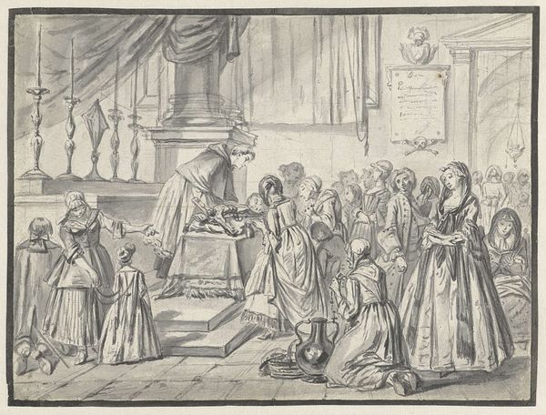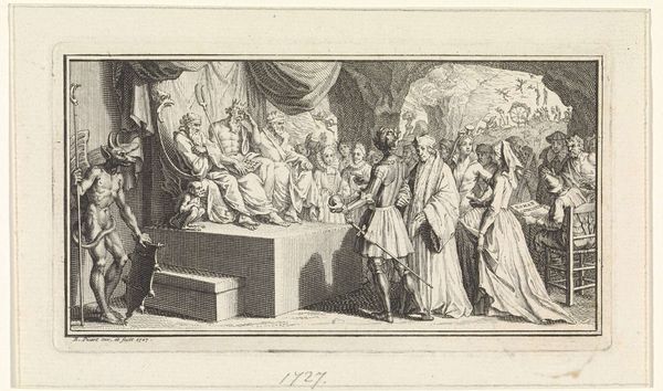 Editor: Here we have "Voorstellen aan het volk van Willem en Maria als de nieuwe koning en koningin van Engeland, 1689" – a print made by Pieter Pickaert in 1689. It depicts William and Mary being presented to the people as the new King and Queen of England. It feels very formal and staged, almost like a theatrical performance. What stands out to you in this piece? Curator: What immediately grabs me is how this image actively participates in constructing a specific narrative around power and legitimacy. Consider the context: William and Mary's ascension was, to put it mildly, politically complex. This engraving, disseminated as a print, wasn't simply recording an event, but shaping public perception. Think about the visual language: Who is included? Who is excluded? And what does that tell us about the intended audience and the message being conveyed? Editor: I see what you mean. There’s a real emphasis on the formal presentation and the presence of key figures. It feels carefully orchestrated. Curator: Exactly! Look at the strategic placement of William and Mary, elevated and central. Now think about the power dynamics inherent in presenting new monarchs to 'the people.' What does it mean to be presented? It suggests a degree of passivity on the part of the populace, a pre-determined agreement. What is left unsaid in the visual rhetoric of power? Editor: So, the engraving isn't just about documenting history, but actively shaping it by controlling the narrative and reinforcing established power structures? Curator: Precisely. It invites us to consider whose voices are amplified, whose are silenced, and how these visual strategies continue to resonate in contemporary representations of power and authority. Consider it a carefully crafted piece of political propaganda operating within the language of art. What do you think? Editor: That really shifts my understanding of the print. I was initially focused on the historical aspect but now I can see all these other factors at play! Thanks. Curator: It's all about understanding art as a participant, not just an observer, in the complex tapestry of social and political life!
