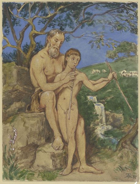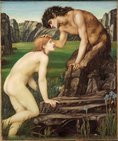 Editor: Today we are looking at "Psyche and Pan", an 1874 oil painting by Edward Burne-Jones, housed here at the Spencer Museum of Art. It has such an ethereal quality to it, yet also something unsettling in the expressions. How do you interpret this work? Curator: It's a quintessential Pre-Raphaelite painting, steeped in the symbolism and mythology that defined much of their output. But let's consider its Victorian context. Burne-Jones, along with artists like Rossetti and Millais, used historical and mythological subjects to subtly critique or offer alternatives to the increasingly industrialized, morally rigid society they inhabited. What's striking about this image? Editor: I think the unusual pairing. Psyche is delicate, and Pan is this…creature. They seem from different worlds, so there’s a power dynamic suggested. Curator: Exactly. Victorian society had very clear ideas about purity and morality. By pairing Psyche, often associated with the soul, with Pan, a symbol of nature and untamed instinct, Burne-Jones challenges these simplistic binaries. Is this a condemnation of raw nature? Or a recognition of the body's essential role in the soul's journey? The museum’s presentation impacts how we see it today, divorced as it is from Burne-Jones' direct social environment. Editor: So, it's not just about the mythological story itself, but how that story was used to speak to Victorian anxieties? Curator: Precisely! And remember, museums play a role, then and now, in shaping those very anxieties and prescribing what we see as “art.” What do you take away from understanding this socio-historical framing? Editor: I see now how the piece engages in a cultural commentary that gives it a much broader relevance. It really highlights the power of art to challenge the status quo. Curator: And perhaps, to remind us that those struggles for definition, between soul and body, order and chaos, remain with us today, filtered through the ever-changing institutions of art.