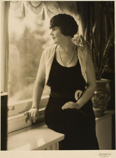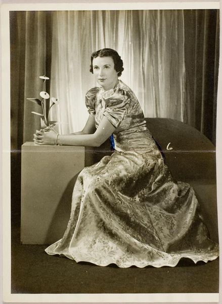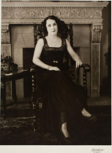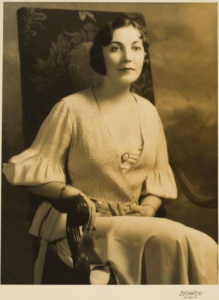Editor: This is a photographic print of Mrs. C. Daehnert by Martin Schweig, currently housed at the Harvard Art Museums. I’m immediately drawn to the patterns and how they interplay. What formal qualities stand out to you in this portrait? Curator: The composition's success hinges on Schweig's masterful use of light and shadow. Note how the illumination sculpts the sitter's form, creating a subtle interplay of highlights and depths. Consider the textural contrast between the floral dress and the plain backdrop. Editor: So it’s about the visual relationships, and not necessarily what the portrait says about the sitter? Curator: Precisely. The photograph operates as a system of visual signifiers, where each element contributes to the overall aesthetic experience. Schweig's strategic arrangement of these signifiers is what generates the image's inherent power. Editor: I see, that’s a new way to think about portraiture. Curator: Indeed, by analyzing the formal elements, we gain a deeper understanding of the artist's intention and the artwork's ultimate impact.