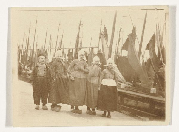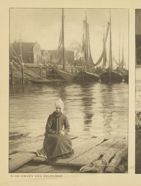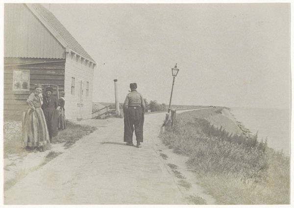 Editor: This gelatin silver print, "Mannen in klederdracht langs de haven in Volendam," made sometime around 1900 to 1910, evokes a sense of quiet solitude, doesn't it? It looks like a scene frozen in time. What's your read on this work? Curator: Yes, absolutely. There’s a real stillness here, almost like stepping back into a forgotten world. I’m drawn to the way the photographer, G. Hidderley, uses light – or rather, the *absence* of harsh light – to create such a subdued atmosphere. The sepia tones and soft focus lend a nostalgic, dreamlike quality. Do you notice how the figures in traditional attire are framed, almost like characters in a play? Editor: I do see that! It almost feels like they're caught between performance and daily life. Curator: Precisely! It taps into something I find very intriguing: the deliberate construction of “Folk” identity during that period. We can think about genre paintings from the Dutch Golden Age, reimagined through the then new medium of photography! It makes you wonder, what was Hidderley trying to capture, or perhaps, create? Editor: It's fascinating to consider how identity is captured – and perhaps manufactured – through art. Thinking about performance really shifts my perspective. Curator: Exactly. Art often prompts us to question our perceptions, and I find that eternally compelling. Editor: I will never look at an old photograph in the same way, now that I see these layers of interpretation. Thanks! Curator: My pleasure. It's always rewarding to find new dimensions within the familiar.