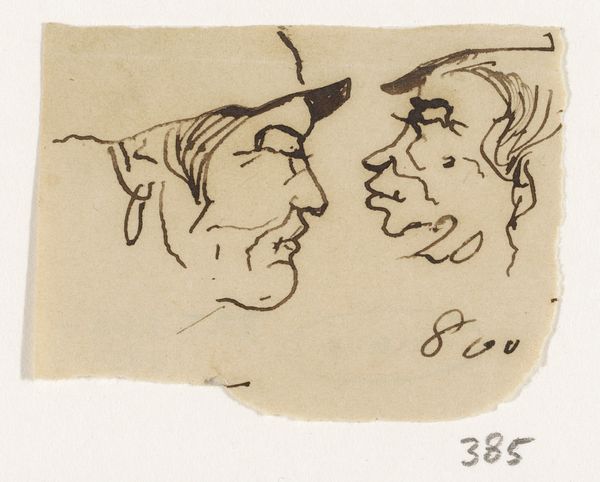 This drawing, Koppen, by Johannes Tavenraat presents three studies of heads, rendered with ink on paper. Note how Tavenraat uses a sparse yet deliberate hand, focusing on the contours to define each figure. The structure of the drawing lies in its study-like arrangement, yet the presence of printed text as the backdrop complicates the reading. The text, fragments of a newspaper or announcement, creates a dialogue between the figures and the cultural context they are situated in. The lines and contours, precise and minimal, highlight the character of each face. The contrast between the controlled strokes of the faces and the chaotic layout of the text suggests a tension between individual identity and social inscription. Consider how Tavenraat uses these formal elements to not just depict but also interrogate the act of representation itself. In this small study, the artist leaves us with the idea that meaning is not fixed.