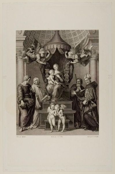 Editor: This is "The Virgin and Child (Madonna of the Canopy)" by Bernard Antoine Nicollet, it's a print at the Harvard Art Museums. It feels very staged, almost like a theatrical production. What can you tell me about its historical context? Curator: The arrangement certainly alludes to staging, doesn’t it? Prints like this one circulated widely, shaping religious and political ideas. Consider the iconography: the Virgin enthroned, flanked by saints. How might this image function in reinforcing the Church's authority and projecting an image of divine order during its time? Editor: So, it's less about personal devotion and more about public image? Curator: Precisely. The image acts almost as propaganda solidifying the church in the public eye. Editor: That’s a really interesting perspective; I hadn't considered the political angle. Thanks!
