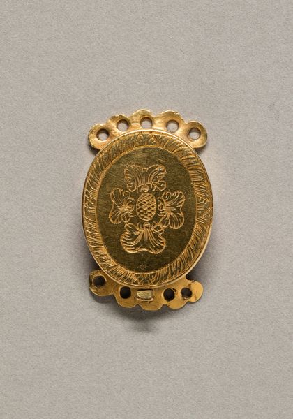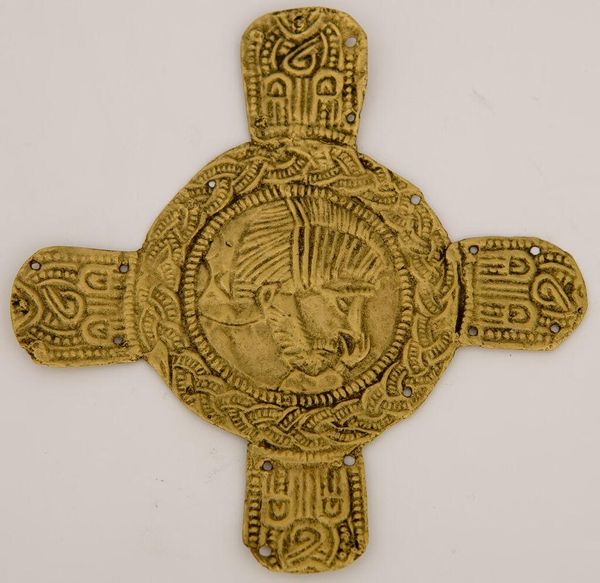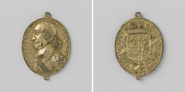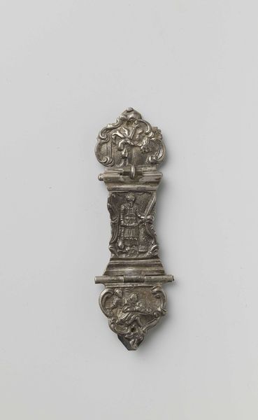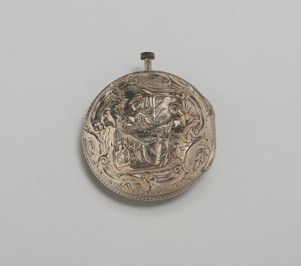 Curator: Welcome. Today, we're looking at a Mannerist relief in the Rijksmuseum collection, “Minerva” by Paulus Willemsz. van Vianen, crafted sometime between 1575 and 1600. It’s worked in metal. Editor: My first impression is… dense. It feels very self-contained, almost like a jewel or elaborate heraldic crest. The sheer detail is striking. Curator: Absolutely. The composition is rigorously organized, almost compartmentalized. Note the tripartite division—the cherubs above, Minerva with her shield and spear in the central field, the leonine masks flanking. This reinforces a visual hierarchy typical of Mannerist aesthetics. Editor: The choice of Minerva, goddess of wisdom and strategic warfare, is intriguing. What symbolic role might she be playing here? We often see her as a representation of the rational mind, but here, almost surrounded by these cherubic figures, is there a counter-narrative at play? Curator: Well, the iconography is fascinating. While Minerva embodies reason, the flanking cherubs and the foliage designs soften that stark intellectualism. Remember, Mannerism loved complexity and tension, a balance of intellect and sensuality. The shield itself, its circular form, provides a compelling geometric counterpoint to the linear thrust of the spear, for example. Editor: And what of the material itself? Working with metal grants a particular sheen and durability to the relief, it ensures the images and their stories, persist, right? I can imagine it shining when caught in a shaft of sunlight, these stories come alive, passed down across time. Curator: Precisely. And don’t overlook how the malleability of the metal has allowed van Vianen to create these almost painterly gradations in relief, look at the softness he gets on the bodies of the figures. It's like chiaroscuro, but translated into three dimensions through the metal itself. Editor: So, beyond the pure formalism, this "Minerva" evokes something enduring—the resilience of wisdom and the continuous human striving towards understanding, framed, crucially, by softer elements. It suggests that those two worlds, knowledge and passion, aren’t actually separable. Curator: A fitting summation. Through its deliberate organization, dynamic lines, and shimmering surface, van Vianen's “Minerva” continues to offer complex narratives through time.