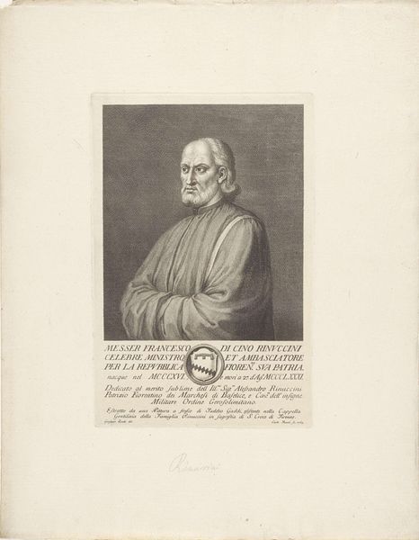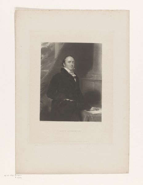 Curator: Charles Turner, a notable engraver working in the Neoclassical style, completed this print, "Portret van George III van het Verenigd Koninkrijk," between 1820 and 1823, employing metal and engraving techniques. Editor: Wow, what a weighty presence! He seems... resigned, almost. The textures, the velvety robe, the backdrop, all contribute to an overwhelming feeling of... solemnity. Curator: Indeed. Considering the historical context, it’s fascinating. George III’s reign was marked by significant political upheaval, including the Napoleonic Wars and the loss of the American colonies, events that shaped British identity profoundly. The portrait then becomes less about celebration and more about embodying national burden. Editor: Burden, yes! The face, while regal, suggests weariness. Even the crown visible in the background feels like another heavy accessory rather than a symbol of power. I feel like I can almost see the pressure of his position etched into his face. Curator: Turner’s choice of the Neoclassical style adds another layer. While Neoclassicism often conveyed ideas of order and reason, here it seems subdued, highlighting perhaps the inherent limitations and social constrains of royal power even within supposedly enlightened systems. Editor: The limited color palette contributes too. A more vibrant palette would possibly project some authority, yet these tones amplify this notion of gravitas, and maybe... austerity? Curator: Precisely. Reflecting on how political figures, especially monarchs, are depicted, the portrait invites critical analysis of power, its representation, and the intersection between individual and state. Editor: I guess you are totally right... it has changed how I see the work now! Initially, I only got its emotional, slightly mournful presence but the way you have shown its social importance brings it to a higher level. It transcends its face value now, for me. Curator: That’s the crux, isn’t it? How the intersections of politics and history meet individual subjectivity. It challenges simplistic views of rulers and perhaps ourselves. Editor: Very powerful... literally. Thank you.