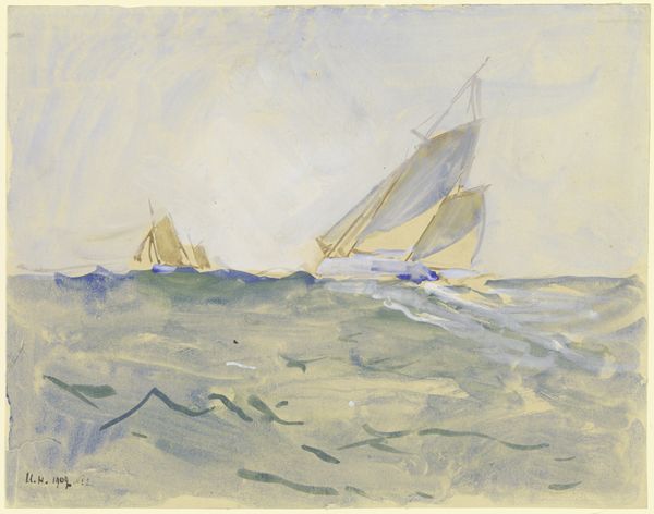 Curator: This is "Sailing," an early oil on panel work by Edward Hopper, dating from 1911. It’s currently residing here at the Carnegie Museum of Art. Editor: It’s... serene. Not in a saccharine way, but in that "calm before the storm" sort of stillness. The brushstrokes are so visible, giving it this wonderful textured surface. I find my eye following the lines of the sails right up to that little blue flag at the top. Curator: Right! It’s very interesting to consider that this piece comes quite early in Hopper’s career. We’re seeing a very different application of Impressionistic techniques, particularly en plein air methods, than we associate with his later, more stark cityscapes. Editor: Absolutely. Look how he captures the movement of the water – it’s not just flat blue, but all these subtle shades and energetic strokes hinting at depth and motion. Makes me wonder what Hopper felt during painting this – a yearning to escape into the quiet, maybe? The lack of detail, like the almost indistinct figures on board, contribute to this sense of generalized, reflective mood, don’t you think? Curator: Indeed. It challenges our usual perception of Hopper as this detached, solitary observer. In "Sailing" there is almost this soft embrace of maritime leisure. Hopper did spend his summers in New England, and perhaps this scene reflects personal joy found in that period. Considering this in the context of art history, many turn-of-the-century artists grappled with finding their own path, separate from established artistic traditions. Editor: Right. The choice to focus on this recreational, almost idyllic, scene in this way says a lot. It situates this work among considerations about leisure, labor, class, and identity that were pervasive in modern art. In an era marked by industrialization, war, and urbanization, finding solace in leisure became a deeply politicized issue. Sailing here might then suggest agency, privilege, even escape from some form of capitalist burden. It’s far from neutral! Curator: What a stimulating read! Perhaps that stillness is more charged than initially appears. Thank you for sharing such valuable insights. Editor: Thank you, I guess, even simple pleasures can carry some heft when they're put on display for us all to contemplate.