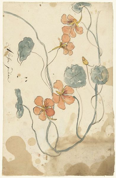 Curator: "Studieblad met vlinderbloem," or "Study Sheet with Butterfly Flower," attributed to Antoon Derkinderen, who was active from 1869 to 1925. The work combines drawing with watercolor and ink on paper. What's your immediate take? Editor: It’s... tentative. Like a whispered secret of nature, still unsure if it wants to be seen. I’m struck by the bare paper, how it allows those subtle greens and the outlines to breathe. Curator: Indeed. Note how Derkinderen’s almost scientific rendering blends with a sense of fleeting observation. The unfinished outlines suggest an exploration of form, not a definitive statement. It’s process made visible. Editor: Exactly! It’s less about the 'perfect' flower and more about the artist's interaction with it, their hunt to pin it down. The variety in detail, some leaves fully colored, others barely there… it's honest. Like a visual diary page. Curator: Consider also the composition—a deliberate arrangement of organic forms across a relatively flat plane. Derkinderen is using the page not as a window onto a scene, but as a space to dissect and present elements of it. Editor: You know, I'm starting to see it as almost a meditation. It lacks that grandiose statement some artists strive for and chooses to stay in a state of gentleness, reflection... it makes me think, what's nature whispering to *me*? Curator: A fitting observation. Perhaps it's precisely that humility which invites us closer. This isn’t a bold pronouncement, but an intimate invitation. Editor: To pause, and just look... and maybe even hear the butterfly flowers whispering! It is something special indeed.
