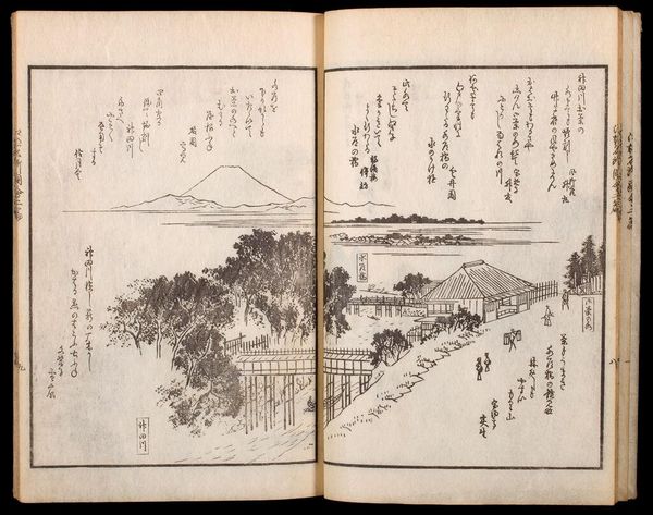 Editor: This is Tani Bunchō's "Illustrations of Japan's Famous Mountains," from the early 19th century. It’s a book, opened to a two-page spread. The starkness of the ink gives the mountains a powerful presence. What do you see in this piece? Curator: Well, these illustrations were created during a time of growing national consciousness in Japan. Bunchō, working within the confines of the Tokugawa shogunate, likely sought to visually map and celebrate the Japanese landscape, thus reinforcing a sense of national identity through depictions of specific, iconic mountains. Editor: So, the political climate influenced the subject matter? Curator: Precisely. The act of documenting these landscapes also highlights the social role of art. How might the accessibility of a printed book, compared to a singular painting, affect its reception and impact? Editor: I hadn't considered the wider distribution. I guess this book helped people connect with their country. Curator: Exactly. It gives us a window into the art's intended purpose.