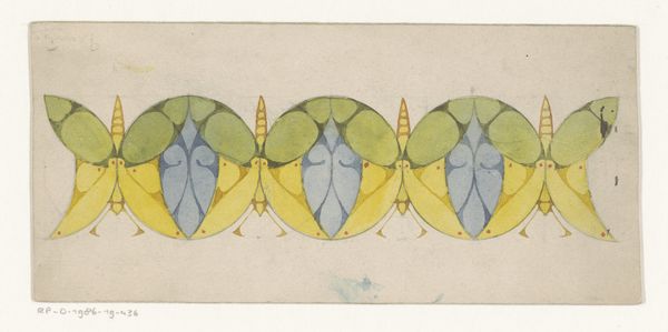 Editor: Here we have "Stylized Peacock with Spread Wings," a watercolor and drawing piece created around 1903 by Reinier Willem Petrus de Vries. There's a very organized, almost mathematically-appealing pattern here, with stylized, muted green shapes stacked in rows, but what strikes me most is this curious blending of the natural with what looks like strict geometry. What's your interpretation of it? Curator: That geometrical structure sings to me of Art Nouveau, an echo of nature captured and distilled through an aesthetic lens. Think about it: artists in that era weren't just painting pretty pictures; they were striving for a harmonious, ordered world. Each geometric form suggests both control and fluidity. What do these repeating elements make you feel? Editor: I can definitely see that harmony between nature and design now that you mention the Art Nouveau style. It still feels rigid, almost like specimens pinned on display. Curator: Ah, yes, that tension is precisely what gives this piece its voice. Vries isn't just celebrating beauty; he’s also subtly framing the way we view the natural world. The wings may symbolize the urge for freedom, yet the rigorous constraints impose an idea of observing from a distance. Are these wings really ready for flight? Editor: Hmm, so it’s this constant push and pull between organic and constructed that really animates the piece. I see what you mean about observing from a distance: I hadn’t considered how its geometry might be a framework *for* viewing, not just *in* the work. Curator: Exactly! I guess we both learn something new from old masters with our contemporary eyes, right?