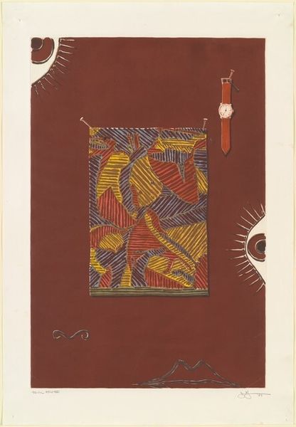 Curator: Tony Fitzpatrick’s "Emerald Spade," created in 1996, combines collage and printmaking in a mesmerizing mixed-media work. Editor: Immediately, I'm struck by the detail. It feels almost textile-like, dense and layered, demanding closer inspection of its textures. Curator: Precisely. Fitzpatrick is a master of juxtaposing disparate elements to create rich symbolic narratives. The spade, of course, has historical weight. Here, surrounded by flora and small figures, its associations of fate, and perhaps misfortune, are softened, subverted. What interpretations surface for you? Editor: I’m drawn to the visible processes, how the materials speak. There’s a clear embrace of collage – the rough edges, the layering. The image alludes to folk art and working-class print traditions, less precious, more accessible than mainstream gallery art. The material composition emphasizes its hand-made quality. Curator: Absolutely. Think about how the artist uses symbolism, too. There's the inclusion of those small characters—hints of outsider culture—interacting with emblems from mainstream playing cards and art nouveau design. It’s like Fitzpatrick’s weaving together the marginal and the dominant, revealing the underlying social tapestry. He’s challenging us to read between the layers, see the connections. Editor: That’s valid, but let’s not ignore the inherent tension that creates when materials meet. The layering and detail may represent how those working-class figures are layered by time, tradition, history. This could explain the color and composition—how the material builds something akin to art nouveau yet diverges significantly. Curator: And to further push the thought about layering: Fitzpatrick’s biographical connection to Chicago—its history of labor movements, its vibrant counter-cultures—deeply informs his choices here. We can read Emerald Spade not just as a visually compelling artwork, but as an archive of lived experience. A history presented to us as material and aesthetic composition. Editor: Agreed. The way he handled his materials communicates on so many levels. I love how it uses everyday materials in the context of “fine art” without ever being inaccessible. Curator: It gives one plenty to consider, viewing as it does the layers and tension—materially, artistically, theoretically. Editor: Precisely, yes. I am happy we dove deeper into those production qualities; it provided such interesting results.