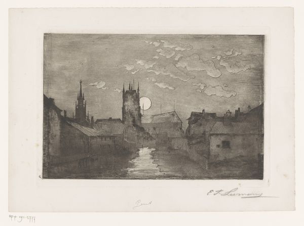 Editor: So, this is "River View in Ghent by Moonlight" by Egide François Leemans, made sometime between 1849 and 1883. It's an etching, a print on paper using ink. It has this dreamy, almost surreal quality. What stands out to you when you look at it? Curator: The moon, of course, dominating the cityscape! Think about how the moon has always held immense symbolic weight. Across cultures, it’s been associated with the feminine, intuition, cycles of life and death. Consider also that the illuminated church, standing tall, merges Christian symbolism with lunar mystique. Do you think that that was intentional? Editor: I hadn’t considered the moon in that symbolic sense. Perhaps. It certainly contributes to the romantic mood. Are there other ways to interpret the scene? Curator: Absolutely. The cityscape itself speaks of human presence, of history etched – pun intended! – into the landscape. Water often signifies the subconscious. So we have reflections shimmering in the dark. What emotions are evoked in you when viewing the image? Does the work relate to something else? Editor: It brings a sense of calm but also a bit of mystery, a feeling that something is hidden just beneath the surface. The details invite contemplation, like memories resurfacing under the moonlight. It reminds me a bit of Turner, with this quiet intensity, but even more intimate. Curator: A keen observation! Turner often looked at vast nature. This is more about personal engagement with it. Look how our minds construct and negotiate with symbolism. The lasting power of art emerges through sustained interpretation across time and viewers. Editor: That's fascinating. I'll never look at the moon the same way again! This really enriched my perspective of how art can use universal symbols to evoke specific emotions and memories.