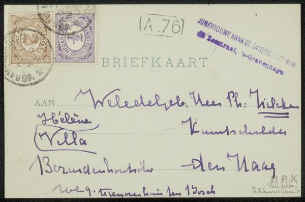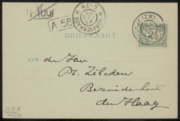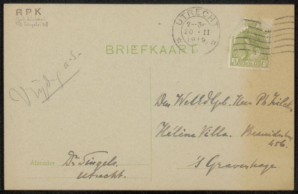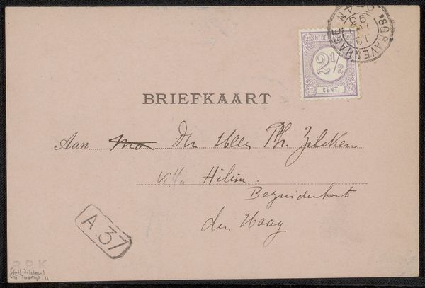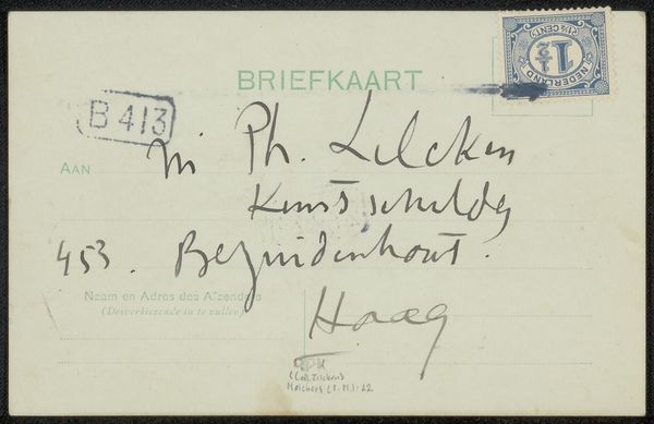 Editor: This is a postcard to Philip Zilcken by Henri Teixeira de Mattos, created before 1914 using ink on paper. The looping cursive script is really striking – it feels like a direct glimpse into the past. What stands out to you when you look at this piece? Curator: The visual language here carries so much cultural memory. Look at the specific formations of the letters, like the ‘H’ in ‘Hague’, they evoke a particular time, yes, but more subtly the weight of social convention governing handwriting itself. Have you considered the sender-recipient relationship? Editor: I hadn’t thought of that. Is there a story in the handwriting itself? Curator: Possibly. The flourishes suggest a degree of formality, but also familiarity, especially contrasted against the stark typography. We see a tension between individuality and societal expectation, embedded within each stroke. It acts as a miniature social portrait. What emotions do those handwritten characters provoke for you? Editor: Curiosity, I think. It makes me want to decode every curve and line and maybe imagine their relationship. Do you think the simple form of a postcard impacts that feeling? Curator: Absolutely. The postcard format itself – a quick, intimate message exposed to the world – adds another layer of meaning. Public and private merging, and the symbolism within it. Editor: That’s fascinating, how much meaning can be packed into something seemingly simple. I’ll definitely look at handwriting differently now. Curator: And consider how our own methods of communication might be studied someday for similar cultural information.