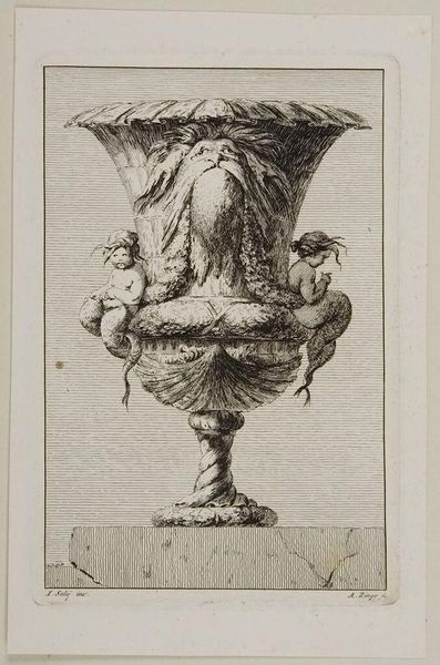 Editor: This etching by Jacques François Joseph Saly from 1746, titled "Vase with a Male Siren holding up a Garland," presents such an ornate object! The detail in the hatching to create the forms is so meticulous, but the overall effect is almost…dense. How might you approach analyzing its form and composition? Curator: Formally, we can observe how Saly employs line to define volume and texture. Note how the cross-hatching intensifies in the shadowed areas, particularly within the garland and on the lower portion of the vase, creating a sense of depth and weight. The composition is structured around a clear vertical axis, yet the profusion of ornamental details introduces a certain visual tension. The siren, for example, is almost overwhelmed by the surrounding foliage. Do you see how the artist directs the eye through these contrasts? Editor: Yes, the contrast between the smoothness of the siren's torso and the rough texture of the garland is quite striking. It also draws attention to the garland being held. How do you read this detail? Curator: This emphasis draws the viewer's attention back to the intricate patterns created by the interweaving lines. The linear nature of the design contributes to its overall elegance, fitting within a baroque aesthetic that values ornate detail and elaborate forms. Furthermore, the consistent application of etching throughout the piece creates visual unity. Do you perceive this effect? Editor: I see what you mean, now. The hatching used to describe the texture of the wall is also similar. All of that line-work certainly ties the piece together, although at first the level of detail made it seem chaotic! Curator: Exactly. It is in appreciating how the individual marks combine to create a cohesive visual experience that the value of such a piece is fully recognised.