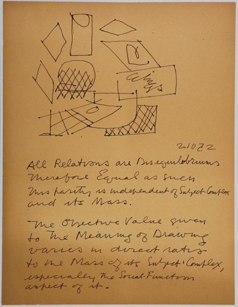 Editor: So, this is "Art Theory Text with Sketch" by Stuart Davis. It's, well, it looks like a page torn from a sketchbook, words and some doodles scattered on it. What do you make of this, aesthetically? Curator: It reminds me of a playful stream of consciousness, like Davis was thinking out loud with both words and images. The text itself, about "the shape of the relation," feels like he's trying to pin down something elusive about perception. Editor: I see what you mean, the doodles are like visual footnotes. The words are kind of heady, but the sketches make it feel more approachable. Curator: Exactly! It's like he’s saying, "Here's the theory, but let's not forget the joy of simply drawing." What do you think is the role of 'control' that he mentions? Editor: I suppose controlling the narrative that he seeks to convey... It's interesting to think about how theory and practice intertwine. Curator: Indeed! Davis reminds us that art-making can be a form of thinking and theory a form of expression.