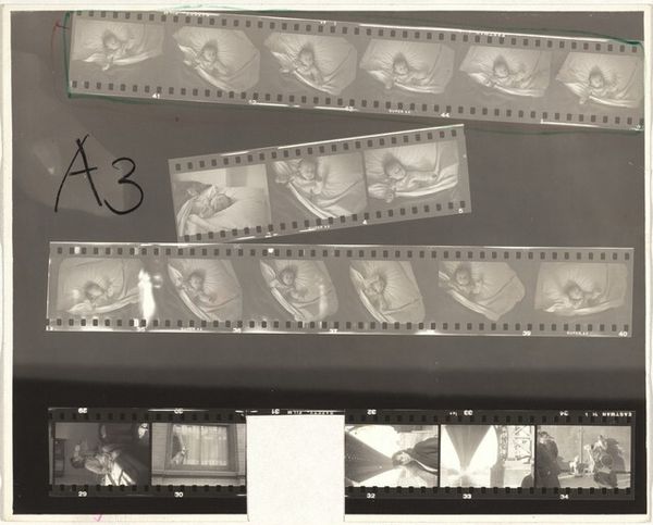 Editor: This is Robert Frank’s "Painters no number", a gelatin silver print from the 1950s. It's essentially a series of contact sheets showing a painter in their studio. I'm immediately drawn to the artist at work, surrounded by his paintings and all the markers of an artistic milieu. How does this photograph speak to the social context of art creation during that period? Curator: This image offers a glimpse into the daily life of an artist, far from the romanticized ideal of the solitary genius. By presenting it as a contact sheet, Frank unveils the working process, the trial and error inherent in artmaking. Consider the social landscape of the 1950s; artistic circles were often tightly knit, with their own hierarchies and power dynamics. Frank, as an outsider in many ways, captures the artist in their raw, unglamorous reality. Do you notice how the frame includes the photograph’s own material evidence? Editor: That’s fascinating, yes. I see it too. It feels very authentic, almost like a behind-the-scenes look. The way it includes the markings on the film is almost like an anti-art statement. Does this piece suggest anything about Frank’s commentary on art institutions, or his intention by capturing painters in what seems to be intimate and unrehearsed settings? Curator: Precisely. Frank often positioned himself outside mainstream artistic circles, acting as a social observer. "Painters no number," presented unconventionally as a contact sheet, perhaps critiques the formalistic tendencies of art institutions, favoring instead an unfiltered perspective of artistic labor. These were the years just preceding the huge popularity of Pop Art; does this influence the image’s social critique in any way? Editor: It does recontextualize this image when viewed against the rise of Pop Art. So, instead of elevating a single polished artwork, Frank gives us an unfiltered view into the process and the somewhat less celebrated environment of the artist. It feels less precious somehow. I appreciate learning that. Curator: Indeed. Frank’s photograph becomes a valuable document, revealing not just an image of an artist, but also the social conditions that shaped their creative production, and how even presentation impacts artistic consumption.