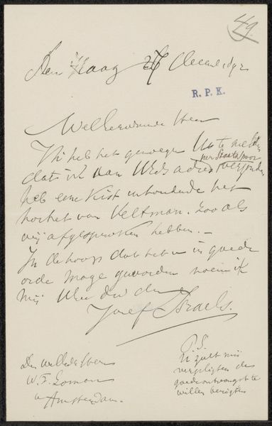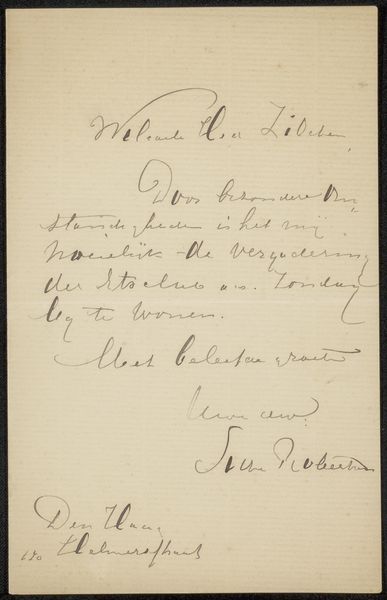 This is a letter written by Jozef Israëls, likely in the late 19th century, to the art dealership Frans Buffa and Sons. Israëls was a leading figure in the Hague School, a group of Dutch artists who reacted against the dominant academic style of the time. They chose to paint landscapes and scenes of everyday life, often focusing on the working class and rural poor. The Hague School can be understood as part of a broader European movement towards realism in art. In France, for example, artists like Courbet and Millet were also depicting the lives of ordinary people. This turn to realism in art reflected the social and political changes that were taking place in Europe at the time, such as the rise of industrialization and the growth of socialist movements. Letters like this one offer a valuable glimpse into the art market and the relationship between artists and dealers. They provide scholars with insights into the social and economic conditions that shaped artistic production in the Netherlands. Examining exhibition records, collectors' correspondence, and other primary sources helps us better understand the institutional context of Israëls's work.