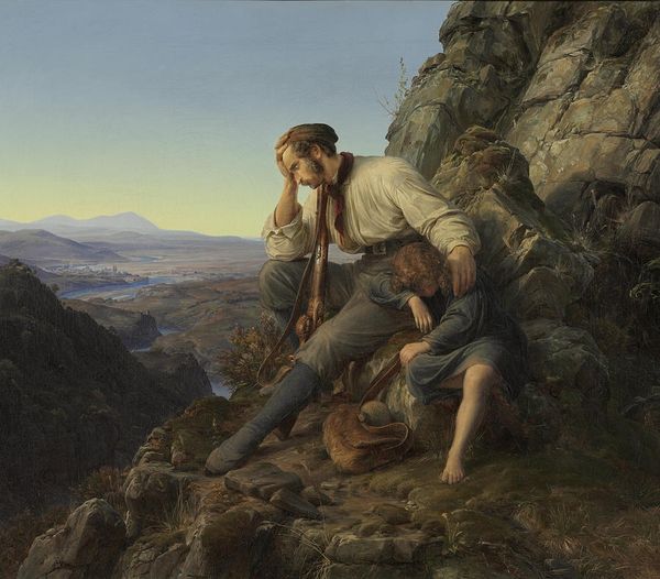 Editor: This is Jerome Thompson's "The Belated Party on Mansfield Mountain," painted in 1858, using oil on canvas. It’s currently at the Metropolitan Museum of Art. The landscape feels so expansive, yet the small group of figures makes it feel quite intimate, doesn't it? What draws your eye when you look at this piece? Curator: Oh, that light! The way the sun filters through the clouds, almost shyly, as if embarrassed to be so lovely. It makes me wonder if the "belated party" is a metaphor. Perhaps they missed a dawn, a moment of awakening. Have you ever felt like you've arrived just after the magic happened? Editor: I can definitely relate to that feeling! It’s bittersweet. Are there other clues pointing to that interpretation? Curator: Absolutely. Notice how they are positioned—observing this breathtaking vista. Is there a shared delight? Or perhaps individual reflections. Each figure seems lost in their own world, dwarfed by the sheer scale of nature. And consider Mansfield Mountain itself! This jagged, imposing presence almost seems to be silently judging their little gathering, like a titan observing ants. Do you feel that sense of scale? Editor: I do! It definitely emphasizes human insignificance against the grandeur of nature. The Hudson River School painters were often trying to evoke the sublime, right? Curator: Exactly! And Thompson, he’s not just painting a landscape. He's painting a feeling, an experience. Perhaps he invites us to examine our relationship with nature. Are we a part of it, or are we simply passing through? A little late, perhaps, for the real party? Editor: That’s fascinating, that melancholy sense of being a bit late. I never would have considered that angle. It’s made me think about the impermanence of moments. Curator: Precisely! That, my dear, is the lingering magic of art. Editor: I see the painting in a completely new light! Thanks for that wonderful reading of the artwork.