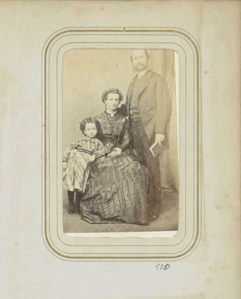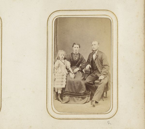 Curator: Looking at this photograph, there's an almost haunting quality. The light has faded with age, giving it this sepia tone. Editor: Indeed, let's delve into the details. We see "Groepsportret van een onbekende man, vrouw en twee kinderen" an albumen print by Hermanus Jodocus Weesing dating somewhere between 1868 and 1900. A relatively early photographic print. Curator: Albumen print…So that means the image is actually embedded within the egg white? The texture looks smooth to the touch. I wonder about the accessibility of this type of photograph to the general public? I also note what appear to be water spots in the emulsion layer. Editor: Right, there's albumen suspended on a paper support that constitutes the final image, but focusing on your inquiry about accessibility and the impact on social status: Family portraits such as these, gaining prominence throughout the 1800s, became powerful symbols of bourgeois aspirations and the evolving definition of familial identity and its place in the cultural imaginary. Curator: It's interesting how the photograph then became another material commodity, wasn’t it? Like the increasing industrialization, the increasing access to mass products that made objects, photographs in this case, increasingly attainable for the growing middle classes. Editor: Absolutely. Consider how galleries curated exhibitions featuring newly printed cartes de visite and portrait cards, establishing market prices as a function of status. The studio becomes a space for not only the taking of a photograph, but the taking of an inventory, marking new cultural habits. And, like any social artifact, studio backdrops served a critical role. Curator: Yes. Here, this family in the image looks almost lost in time now that you mention this. Even so, with the social historical context it represents, this small albumen print carries a significant amount of representational weight. Editor: A window into a specific time.